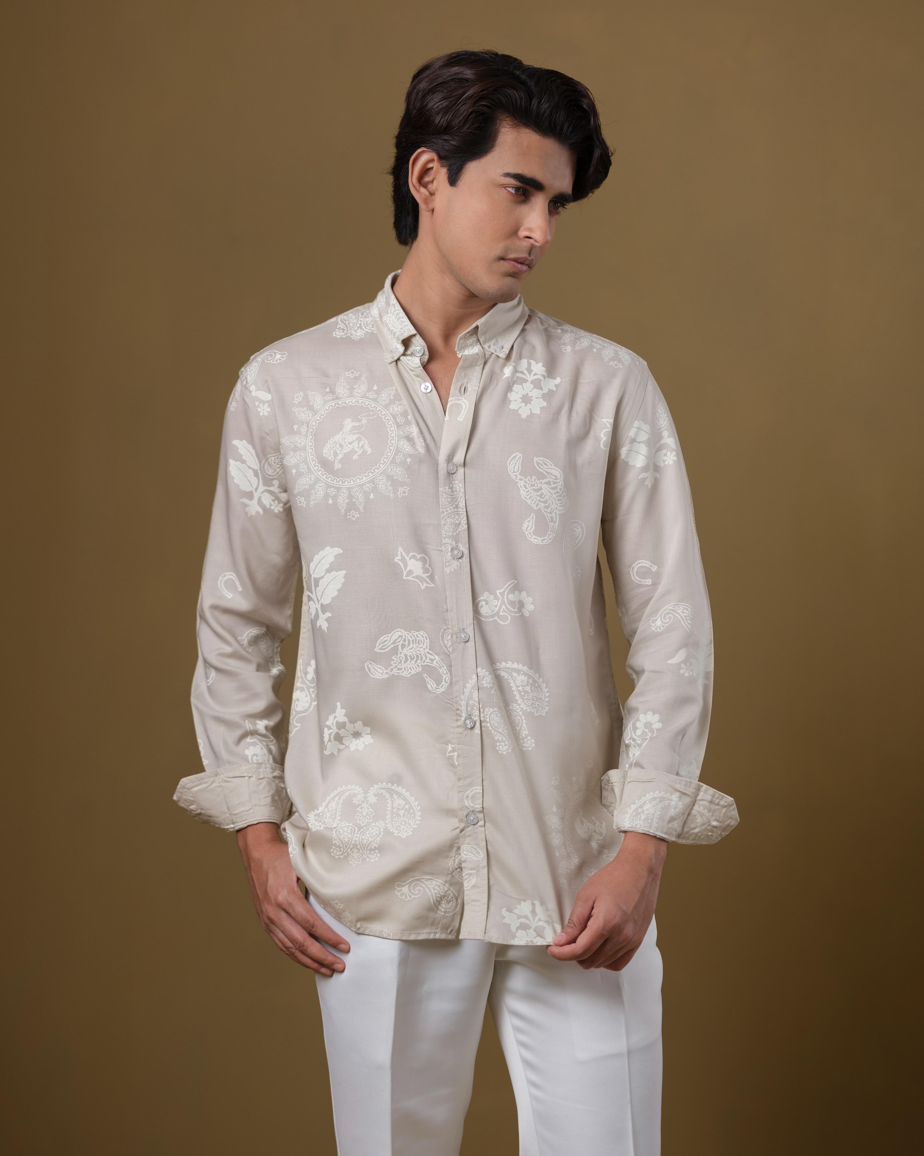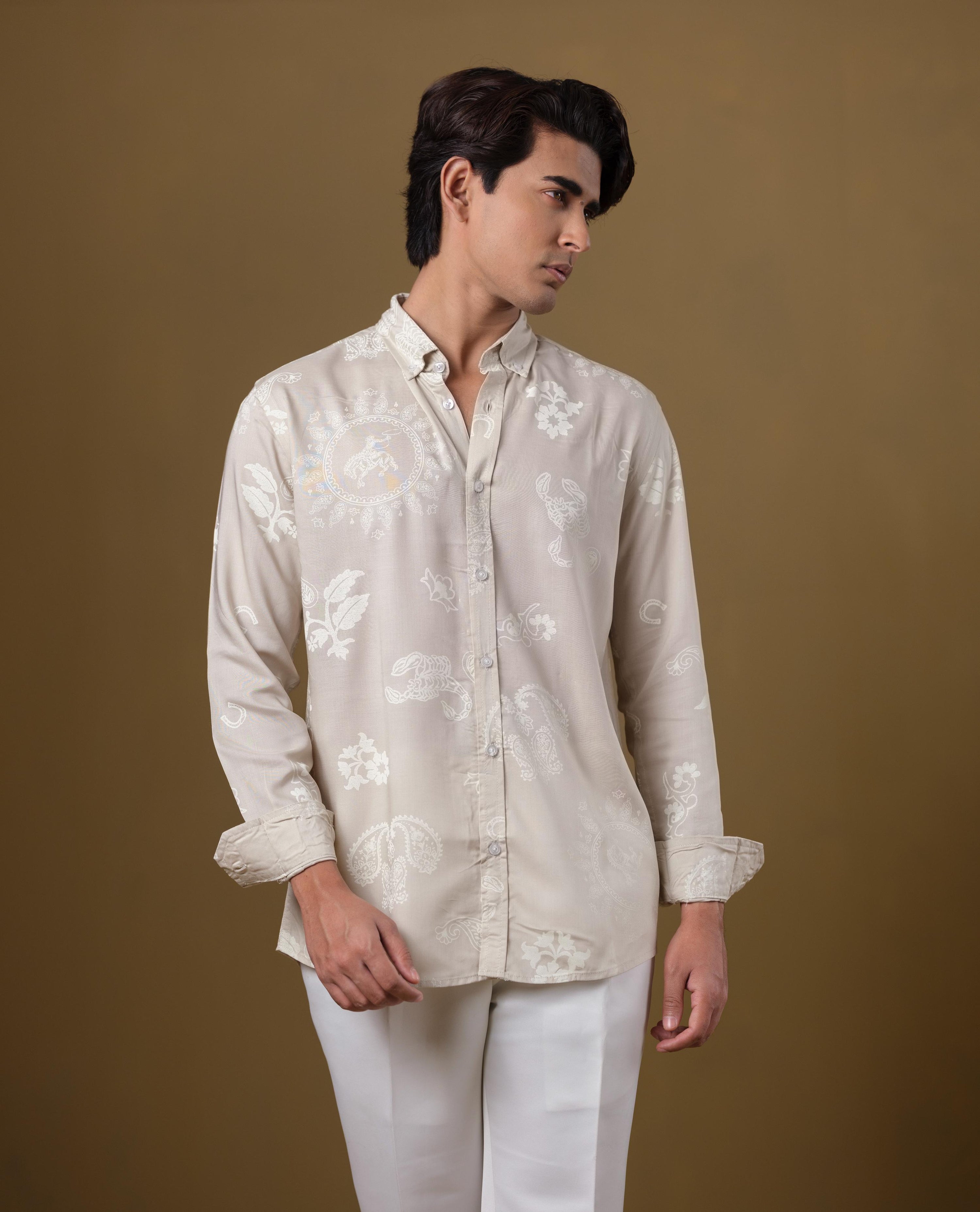 Crafted from breathable premium cotton fabric, this slim-fit shirt features an all-over white paisley and heritage-inspired print on a soft beige base. The subtle tonal contrast keeps it sophisticated and versatile, while the artistic pattern adds depth and character.