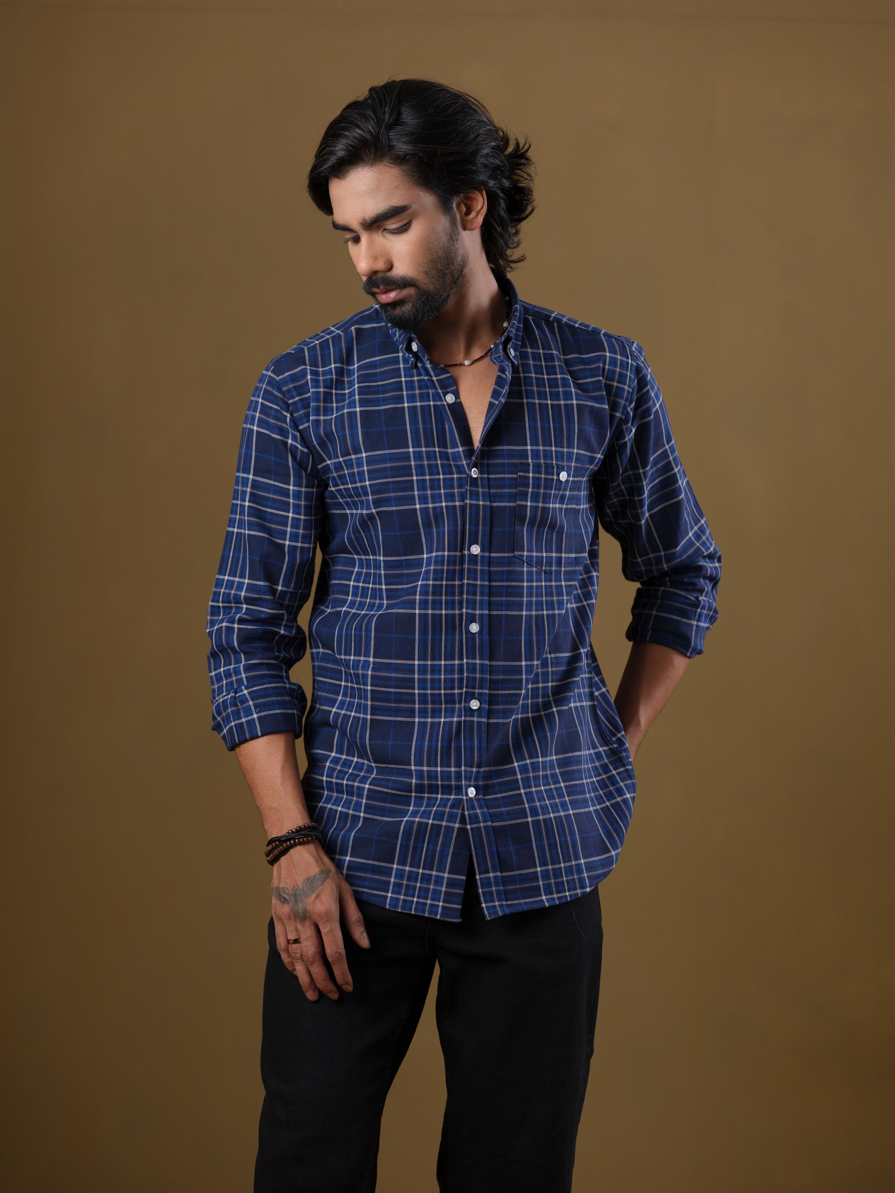A timeless essential with everyday versatility — the Men’s Navy Blue Plaid Check Shirt is designed for effortless smart-casual styling.