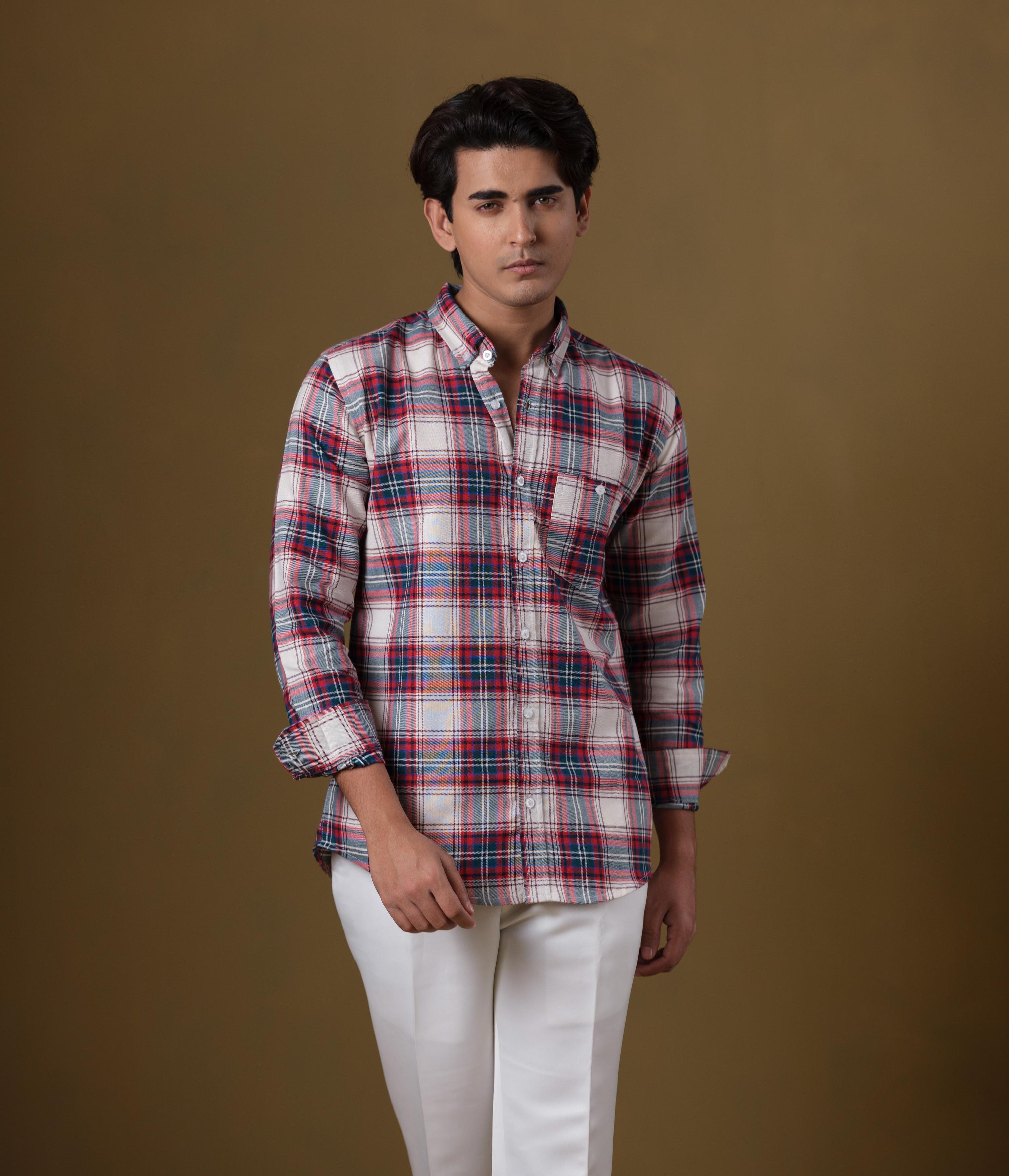 Crafted from breathable premium cotton fabric, this slim-fit shirt features a striking red, navy, and off-white tartan plaid pattern. The vibrant yet balanced color combination adds strong visual appeal, while the structured check design keeps it timeless and versatile.